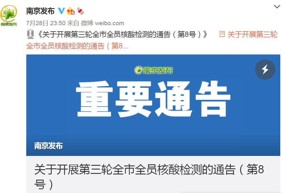 來源:“南京發(fā)布”微博檢測范圍:全市范圍內全部居民(含暫住人...