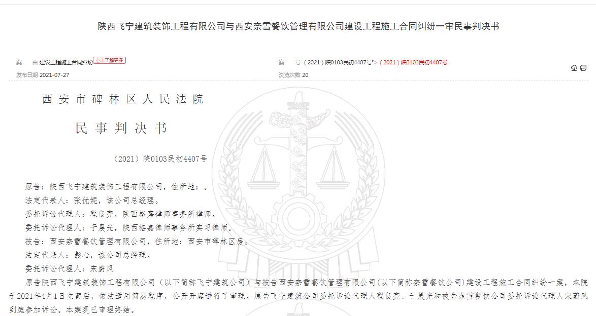 根據陜西飛寧建筑裝飾工程有限公司與西安奈雪餐飲管理有限公司建...